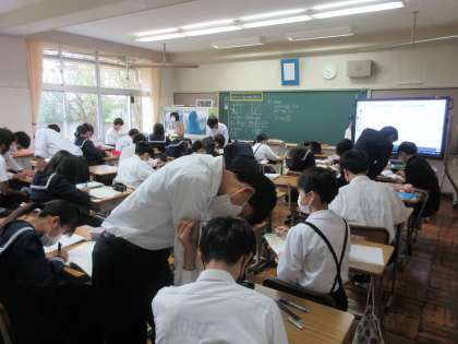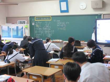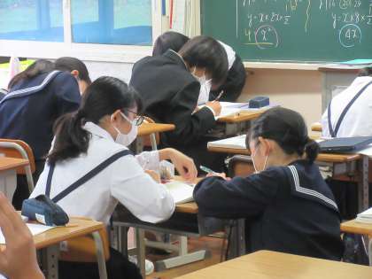 「図形の中にあらわれる関数」について学習をすすめています。教室を訪問した時は、授業の終末の練習問題を解いている場面でした。最後まであきらめず問題に取り組む3年生。頑張っています!