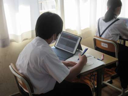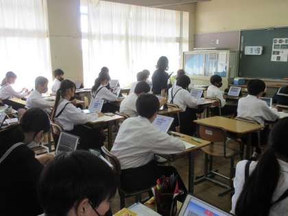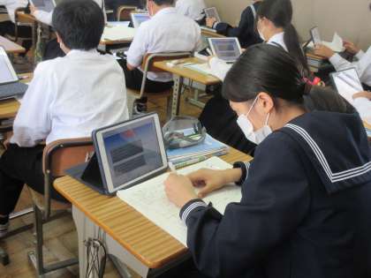 タブレットに写し出される結果や考察をもとに考えを深めています。1年生もタブレットを上手に活用し課題に取り組んでいます。