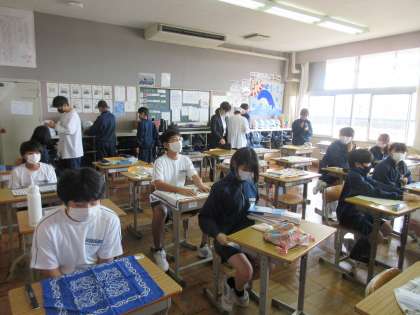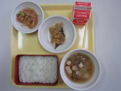 今日の給食のメニューは、栗ごはん・牛乳・ますのねぎ味噌焼き・切り干し大根の煮物・芋の子汁 です。