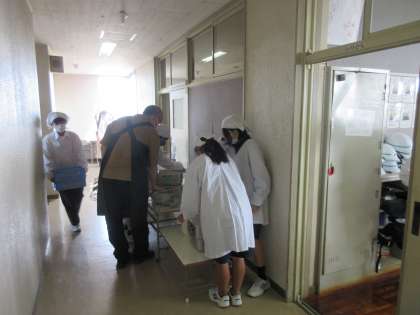 今日から、1・2年生の教室では教育実習の先生が一緒に給食に入るクラスがあります。一緒に準備をしている姿が見られました。写真は1年生の給食の準備のようすです。