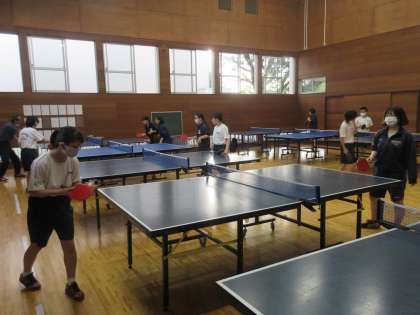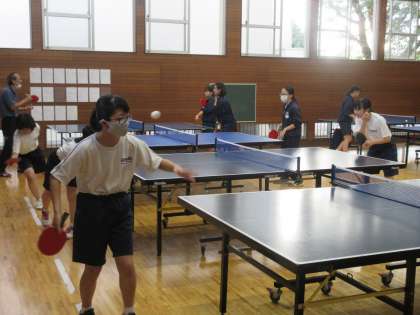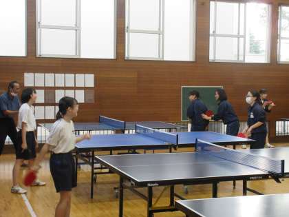 武道場では、明日の大会出場に向けて、ラリーを繰り返す女子卓球部の生徒の姿が見られました。時折、笑顔が見られる明るい雰囲気の中で、集中した練習が行われています。
