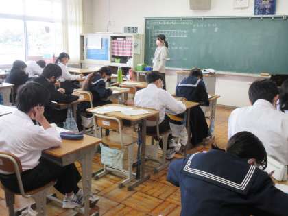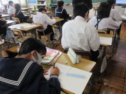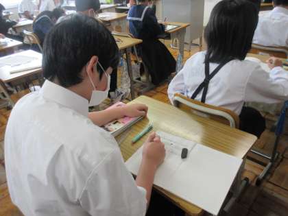 比例定数が負の数の場合について考えています。表を見ながら、自分の考えをノートに進んで記入する1年生。頑張っていますね!