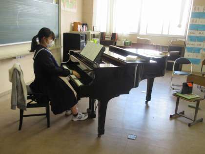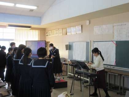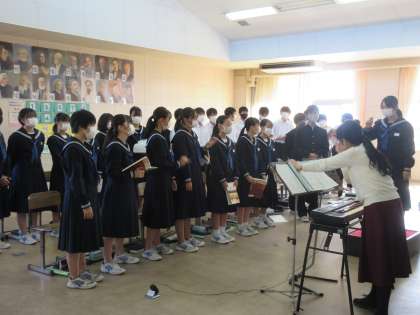 「他のパートや伴奏を聴きあって歌おう」という課題のもと、全体での合唱練習に取り組んでいました。細かいところについて、音楽の担当の先生に助言を受けながら、熱心に繰り返し練習する生徒たち。よりよい合唱に向け、3年生は真剣そのものです。(本クラスは「虹」の合唱に取り組んでいます。)