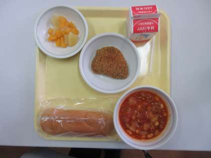 今日の給食のメニューは、コッペパン・牛乳・かぼちゃコロッケ・チリビーンズ・フルーツミックス です。
