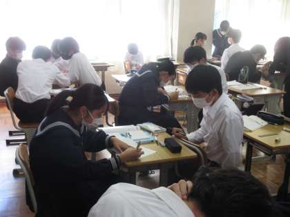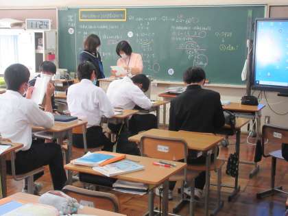 「相似な図形にはどんな性質があるのだろう」という課題のもと、学習に取り組んでいます。学習のまとめに取り組んでいた練習問題では、何とか解決しようと近くの友達と確認しながら根気強く取り組む3年生の姿が見られました。あきらめない気持ち、大切ですね!