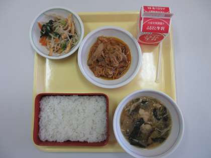 今日の給食のメニューは、ごはん・牛乳・県産白菜の豚キムチ・小松菜のおひたし・さつま汁 です。