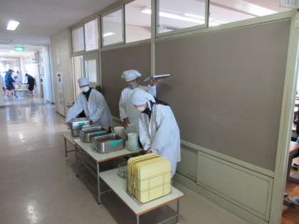 1年生の給食前のようすです。給食当番の素早い準備、いいですね!