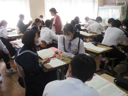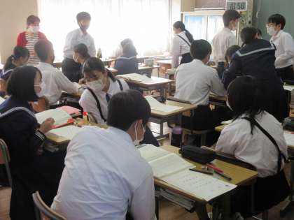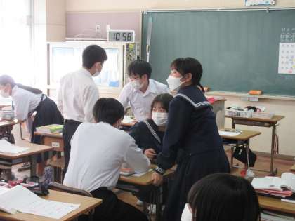 五言絶句を学習をしています。五字四行で書かれた漢詩について、その謎を友達と協力して見つける生徒たち。どんな謎が見つかったのでしょうか。進んで情報交換をする生徒たち。とてもいいですね!