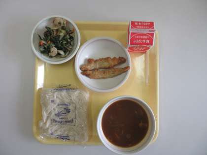 今日の給食のメニューは、ソフトめん・牛乳・ししゃものフリッター・ちくわのおかかあえ・カレー南蛮 です。