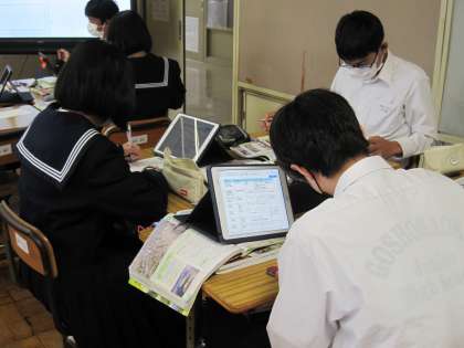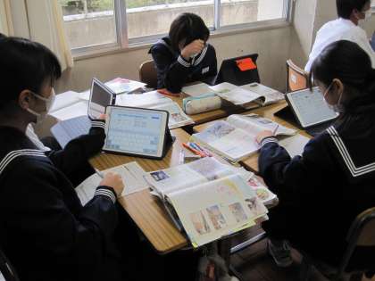 近畿地方のまとめとして、「テレビ局の「ディレクター」になって近畿地方を発信しよう」という学習を行いました。これまで学習してきたことから、ニュース番組の特集コーナーの企画書をつくる活動です。自分の班や他の班のまとめてきた資料をもとに、活用できる情報を取捨選択しながら、取り組んでいました。