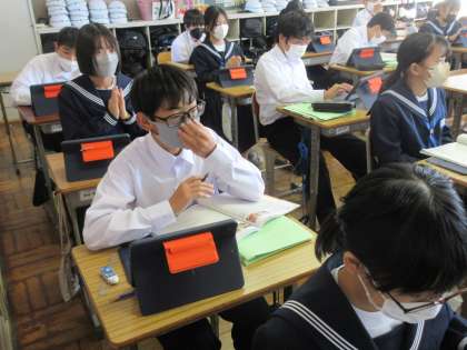 10月26日(水)授業風景 その2 公開日 2022/10/26 更新日 2022/10/26 お知らせ 1年生の家庭科の授業です。 「食品はどんな栄養素が含まれているのか」という課題に向かって学習をすすめています。 食品成分表もとに、生徒たちは調べています。細かな資料もきちんと読み取る1年生。頑張っていました。