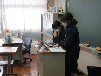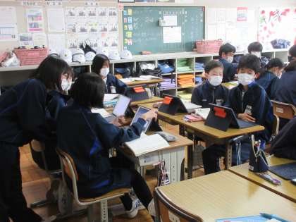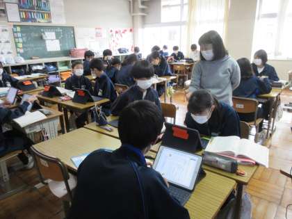 「走れメロス」の学習に取り組んでいます。太宰治は「なぜたくさんの脇役や困難を登場させたのか」を追究しています。グループごとの発表を聞き、質問を真剣に考える生徒たち。考えが深まっています。