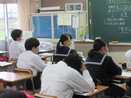 11月21日(月)授業風景 その2 公開日 2022/11/21 更新日 2022/11/21 お知らせ 3年生の社会科の授業です。 「契約とは何か」について学習を進めています。消費者と販売者の間にある「合意」についてイメージを広げていました。そのような中でも、消費者主権ということが大切であることに生徒たちは気付いていきました。