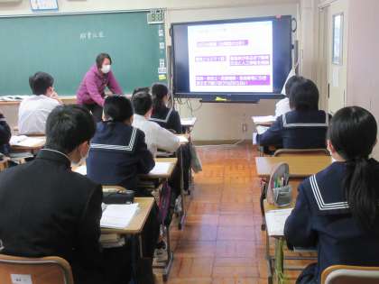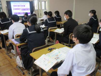 11月21日(月)授業風景 その4 公開日 2022/11/21 更新日 2022/11/21 お知らせ 2年生の保健の授業です。 心肺蘇生について学習を深めています。「人が倒れた」というとき、どんな対応を中学生としてとるべきか、イメージしておくことは大切ですね。集中して、学習課題に取り組む2年生の姿が見られました。