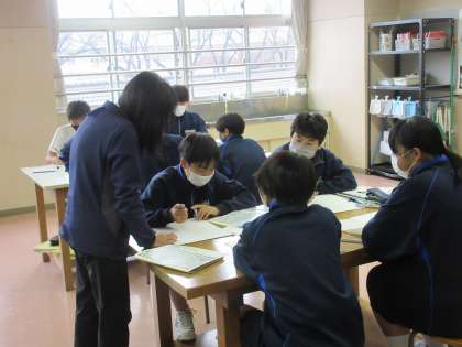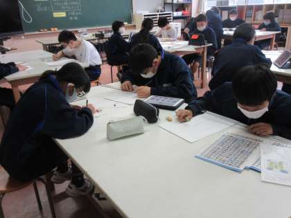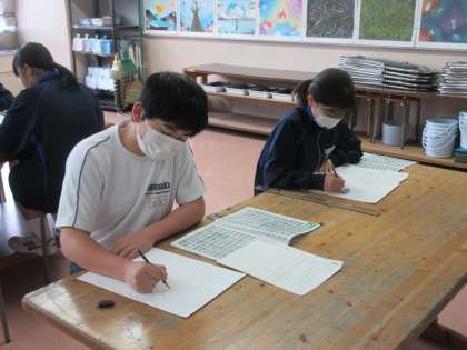 11月21日(月)授業風景 その6 公開日 2022/11/21 更新日 2022/11/21 お知らせ 1年生の美術科の授業です・ 「絵文字をつくろう」の学習もすすみ、いよいよ画用紙に下絵を描き始めました。今日のテーマは「線をきれいにかき、肉付けをする」です。1つ1つの作業をていねいに進める1年生。すでに、迫力のある絵文字の形が見え始めています。