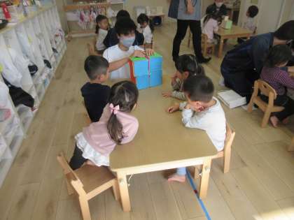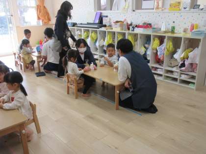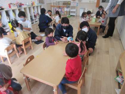 11月22日(火)3年生保育実習 その1(守谷キラッと保育園にて) 公開日 2022/11/22 更新日 2022/11/22 お知らせ 今日は、3年2組が家庭科の授業(保育実習)に取り組んでいます。家庭科の時間につくった「手作りおもちゃ」で、幼児と過ごす生徒たち。とても、よい経験になっています。本日もご協力、ありがとうございます。