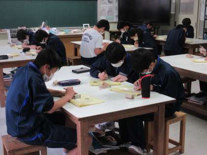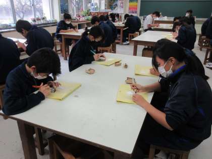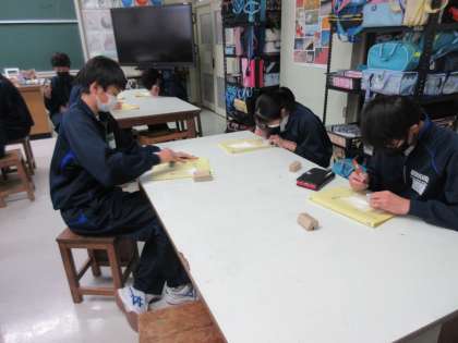 篆刻の持ち手の部分を彫り始めていました。構想を練りに練った持ち手の部分をいよいよ削っていきます。集中して作業に取り組む2年生。頑張っていました!