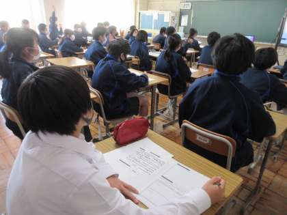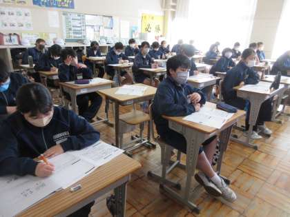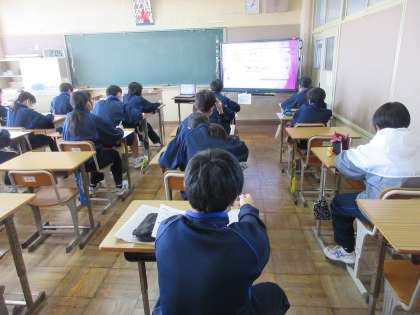 12月7日(水)授業風景 その2 公開日 2022/12/07 更新日 2022/12/07 お知らせ 1年生の総合の授業です。 「進学の道の幅を広げよう」という課題のもと、将来を見通した中での高校進学について、生徒たちはイメージを広げていました。 「公立」と「私立」の違い、「普通科・総合学科・定時制・通信制」・・・・など、電子黒板に写し出される資料をもとに高校についてイメージを広げていました。