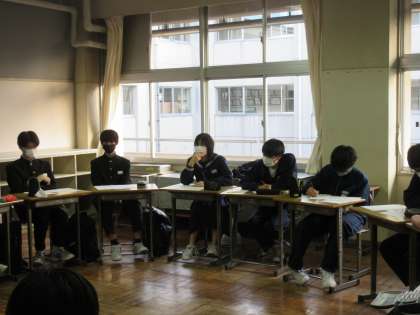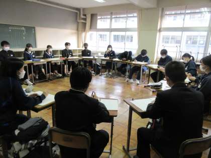 放課後の1つの教室では、各学級の代表者が集まり、「校則検討委員会」が実施されています。時代に合わせた、そして本校に合った校則の改善を目指し、代表の生徒たちは頑張ってくれています。