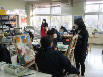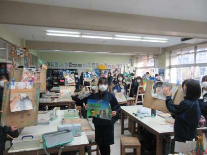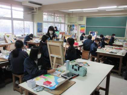 12月7日(水)放課後のようす(美術部) 公開日 2022/12/07 更新日 2022/12/07 お知らせ 放課後の美術室では、素敵な作品づくりに打ち込む美術部員の姿が見られます。教室をのぞくと、全員が作品を見せてくれました。現在は「家族の日ポスター」や「読書感想画」を描いています。どの作品も工夫された作品ばかりです。集中して作品づくりに取り組んだり、友達と助言し合ったり、みんなで頑張っています。完成に向けて頑張っています!