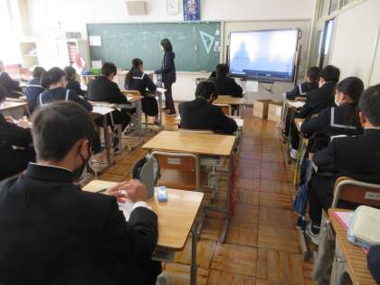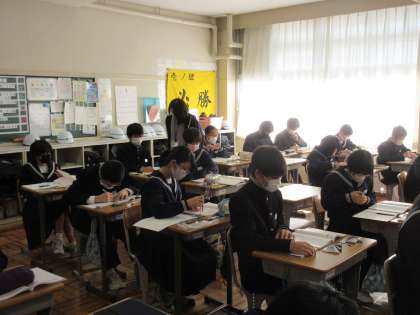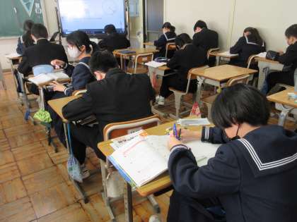 12月8日(木)授業風景 その2 公開日 2022/12/08 更新日 2022/12/08 お知らせ 1年生の数学科の授業です。 これまで学んできたことをもとに、いろいろな作図にチャレンジしていきます。定規やコンパスを使い、ていねいに作図をする生徒たち。根気強く取り組む姿が見られました。