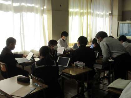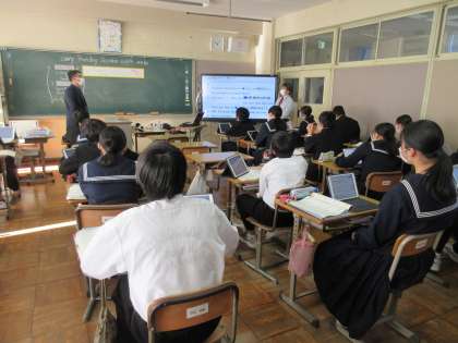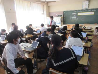 12月8日(木)授業風景 その5 公開日 2022/12/08 更新日 2022/12/08 お知らせ 2年生の英語科の授業です。 「ペアになってメモの内容を相手に相談する」という課題にもと、相談内容(how to〜を使って)、実現の方法(You can〜)を英語でメモ書きをして、いよいよペアでやりとりをする場面でした。すすんで英語での会話にチャレンジする生徒たち。伸び伸びと活動するようすが伝わってきました。
