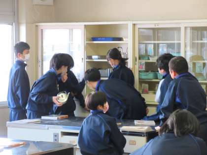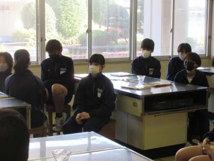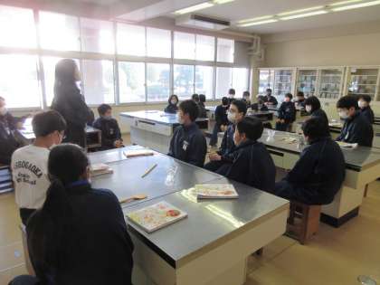 12月9日(金)授業風景 その4 公開日 2022/12/09 更新日 2022/12/09 お知らせ 1年生の家庭科の授業です。 調理室での初めての学習です。「調理室には何があるか」という課題にもと、担当の先生から出されるクイズをもとに、しゃもじ、計量カップ、菜箸・・・などを確認していました。調理室での学習も楽しみですね!
