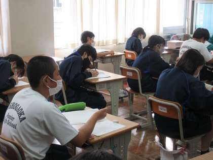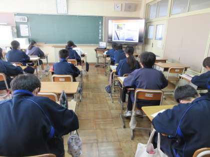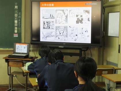 12月9日(金)授業風景 その5 公開日 2022/12/09 更新日 2022/12/09 お知らせ 1年生の総合的な学習の時間です。 「職業人の話を聞こう」という課題のもと、今日は、プロの漫画家の方の話を聞いています。漫画をつくるにはたくさんの人が関わっていることの他、漫画ができるまで、学生時代の話などを聞かせていただいています。オンラインでの授業ですが、生徒たちは、気になることを積極的にワークシートに記入していました。