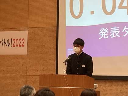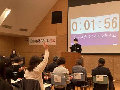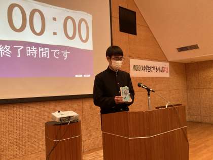 12月10日(土)MORIYA中学生ビブリオバトル2022 その2 公開日 2022/12/10 更新日 2022/12/10 お知らせ 2人目のバトラーは、2番目に出場しました。「虹色の世界」が見える人どうしのつながりを描いた本の紹介をしてくれました。紹介後の審査員からの質問にも、落ち着いて、本のよさを伝えてくれました。