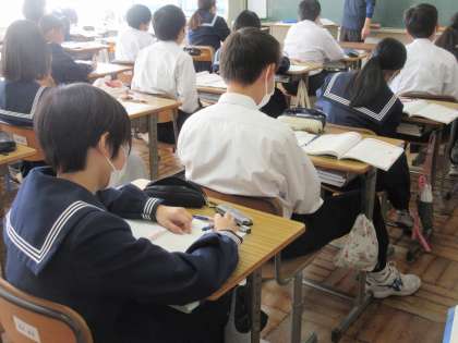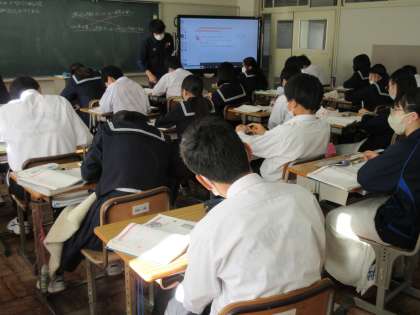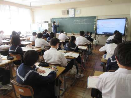 仮定と結論を入れ替え、それが成り立つかを考えています。ちょうど、教室を訪問したときは、「x=2 y=3ならば x+y=5である」逆にすると成り立つかについて、考えていました。筋道を立てて考える活動を生徒たちは、熱心に行っていました。