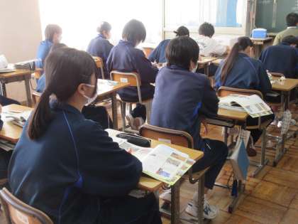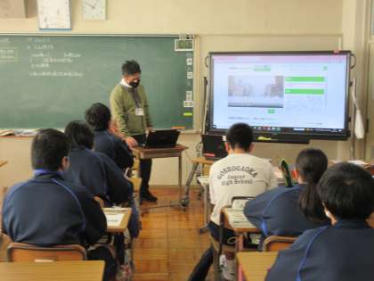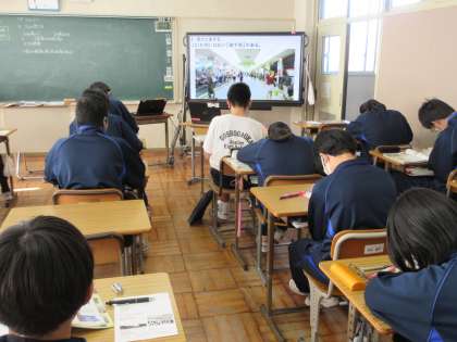 12月12日(月)授業風景 その7 公開日 2022/12/12 更新日 2022/12/12 お知らせ 2年生の社会科の授業です。 北海道地方の学習をすすめています。雪・地下街・火山などのキーワードから、北海道地方のイメージを広げています。電子黒板に写し出される映像や写真・資料をもとに、生徒たちはイメージを広げていました。