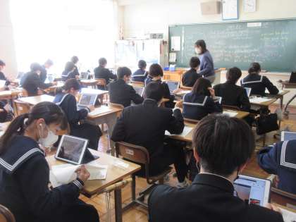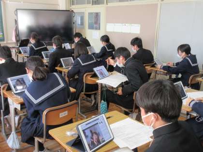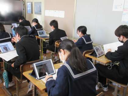 1月26日(木)授業風景 その6 公開日 2023/01/26 更新日 2023/01/26 お知らせ 2年生のもう1つのクラスでも英語科の授業で、DMM英会話にチャレンジ中でした。真剣に英会話に取り組む中でも、笑顔が見られる生徒もいました。頑張っていました!