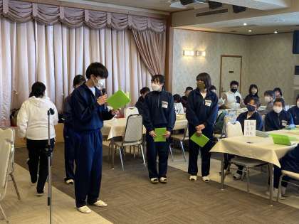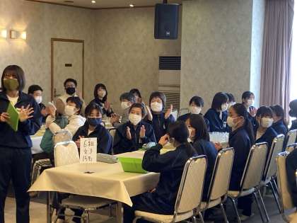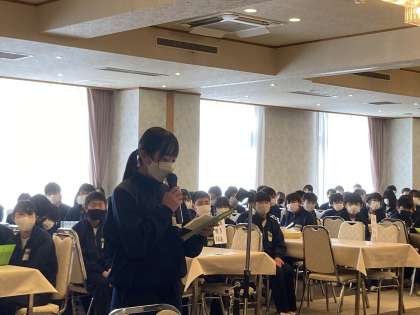 入館式を実施しました。代表の生徒からホテルの方へ、あいさつをしました。ルールとマナーに気を付け3日間お世話になること伝えました。いよいよこのあと、スキーの実習です。