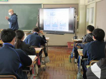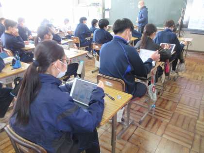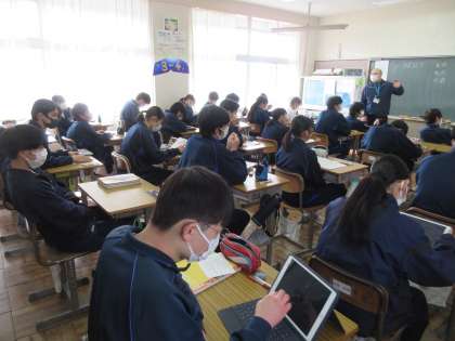 2月3日(金)今日の授業風景 その3 公開日 2023/02/03 更新日 2023/02/03 お知らせ 3年生の社会科の授業です。 テスト対策で、担当の先生から示された問題を解決していました。雨温図をもとに、どこの都市のものか考える問題です。復習を大切にしていってほしいと思います。担当の先生から送られるデータをタブレットで見て、解答する生徒たち。タブレットの活用も進んでいます。