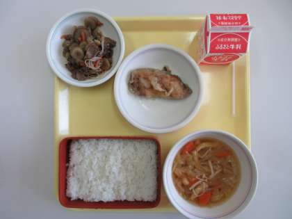 今日の給食メニューは、ごはん・牛乳・さばのみぞれあんかけ・ごぼうと牛肉の炒め煮・白菜と油揚げの味噌汁 です。