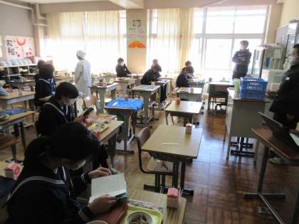 1年6組の給食の準備のようすを見に行くと、当番を中心に、自分たちでどんどん準備を進める姿が見られました。進んで活動できる1年生の生徒たち。素晴らしいです!