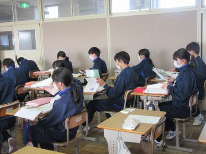 2月7日(火)今日の授業風景 その2 公開日 2023/02/07 更新日 2023/02/07 お知らせ 1年生の国語科の授業です。 教材文「ニュースの見方を考えよう」をもとに、筆者の意図を読み取っています。筆者である池上 彰さんの文章の構成を捉え、その主張を読み取っていました。文章をしっかり読みながら課題に取り組む1年生。集中していました。