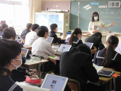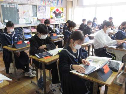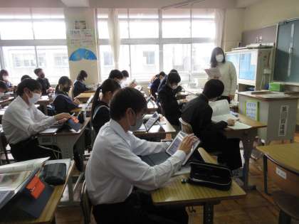 「世界遺産の特徴について、特別な価値を考える」という目標をもちながら、正解遺産の写真を見ながら、英語の学習に取り組んでいます。広い視野をもって学習に取り組む生徒たち。英語の学習を通して、世界との関わりの大切さを感じています。