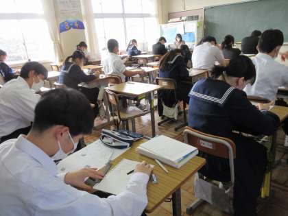 1時間目は、5教科の授業に3年生は取り組んでおり、受験対策の問題に取り組んでいます。どの教室の生徒たちも、集中して課題に取り組む3年生の姿が見られます。目標に向かって、日々、努力を続ける3年生を応援していきたいと思っています。