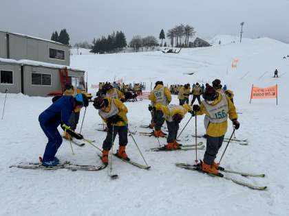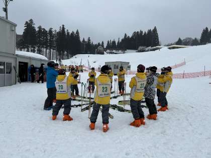準備運動をしたりスキー板の付け方外し方を教わってます。