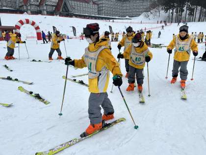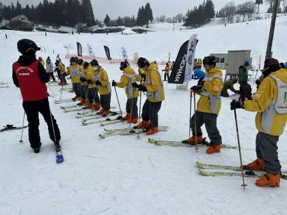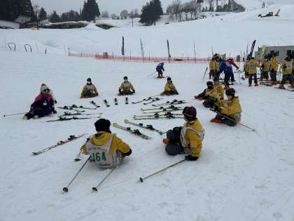転び方や片足だけ板を付けて進む練習など、各グループいろいろです。