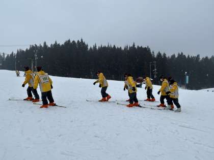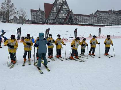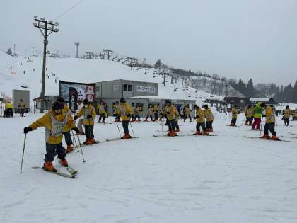 みんな真剣です。インストラクターさんの話をよく聞いて、少しずつ雪に慣れています。