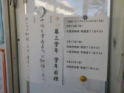 2月9日(木)今日の授業風景【図書室前の掲示板】 公開日 2023/02/09 更新日 2023/02/09 お知らせ 3学年の図書室前の掲示板には、公立高校の受検リハーサルのお知らせが掲示されていました。受検の日が近づいてきています。体調面に十分気をつけながら、当日に全力が出せるように、準備を進めていってほしいです。3年生の皆さん。頑張っていこう!
