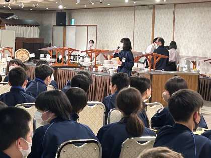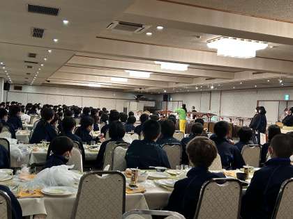 夕食の時間 公開日 2023/02/09 更新日 2023/02/09 お知らせ 夕食の最後に実行委員さんや先生たちから話がありました。また、残り1日を無事にルールを守って行動できるよう、みんなでスローガンや目標の確認をしました。