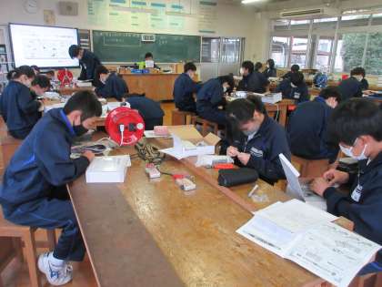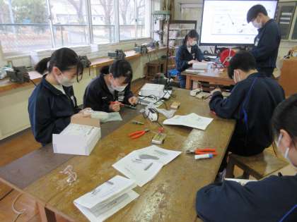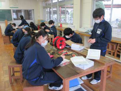 2月13日(月)今日の授業風景 その6 公開日 2023/02/13 更新日 2023/02/13 お知らせ 2年生の技術科の授業です。 はんだごての使い方にも慣れ、今日は、はんだごてを使った実験にも取り組んだようです。「直流についてのイメージをもつことができた」と振り返りに記入する生徒もいました。技術のおもしろさを感じながら、学習を深めています。