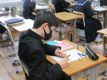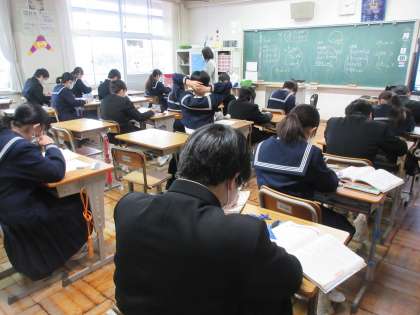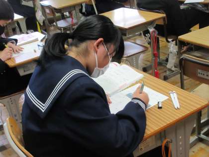 2月13日(月)今日の授業風景 その7 公開日 2023/02/13 更新日 2023/02/13 お知らせ 1年生の数学科の授業のようすです。 平面図形の練習問題にチャレンジしています。自分の力で、1問1問、根気強く取り組む1年生の姿が見られました。作図などもていねいに、定規を使って完成させています。根気強く取り組む姿勢は、本校の生徒たちの大切に伸ばしていきたいよいところです。