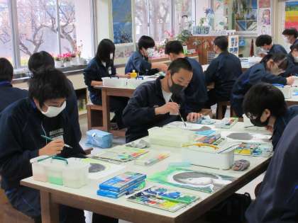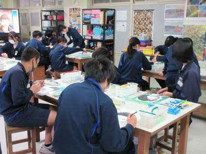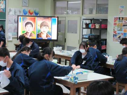 2月13日(月)今日の授業風景 その8 公開日 2023/02/13 更新日 2023/02/13 お知らせ 3年生の美術科の授業です。 自画像の作品づくりも進んできています。今日は、背景の彩色に取り組んでいました。自分なりに工夫し、一人一人の生徒がすてきな背景の色づけをしています。担当の先生からアドバイスをいただいたり、友達と相談したりしながらていねいに作業をすすめています。少しずつ完成が近づいてきていますね。