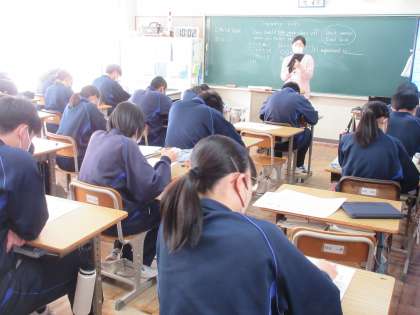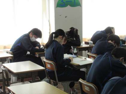 英語科では、リスニングの問題にチャレンジしていました。聞き漏らすことがないように、集中してリスニングに取り組む生徒たち。これまでの学習の成果を発揮してほしいと思っています。