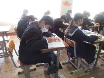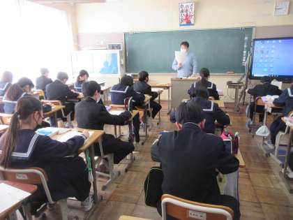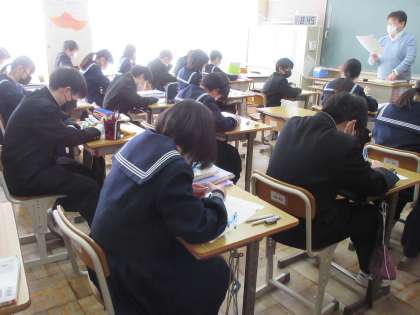 2月15日(水)今日の授業風景 その2 公開日 2023/02/15 更新日 2023/02/15 お知らせ 1年生の数学科の授業です。テストに向け、プリントを活用した振り返りをしています。問題には、基本の作図、点対称移動の作図・・・など、様々な作図にチャレンジする問題です。担当の先生から、早く・正確に・美しくという助言をいただき、生徒たちはそれをしっかり受け、問題に取り組んでいました。