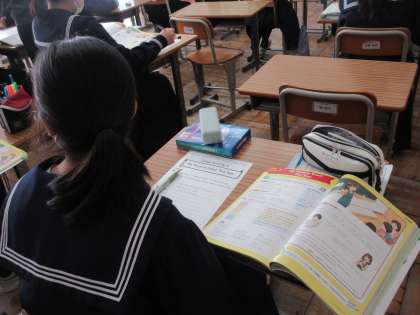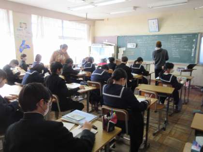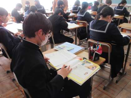 1年間の中学校生活を思い出を考えながら、英語で表現する活動。生徒たちは、これまでの学習を生かして、英語の文章を熱心に作っていました。